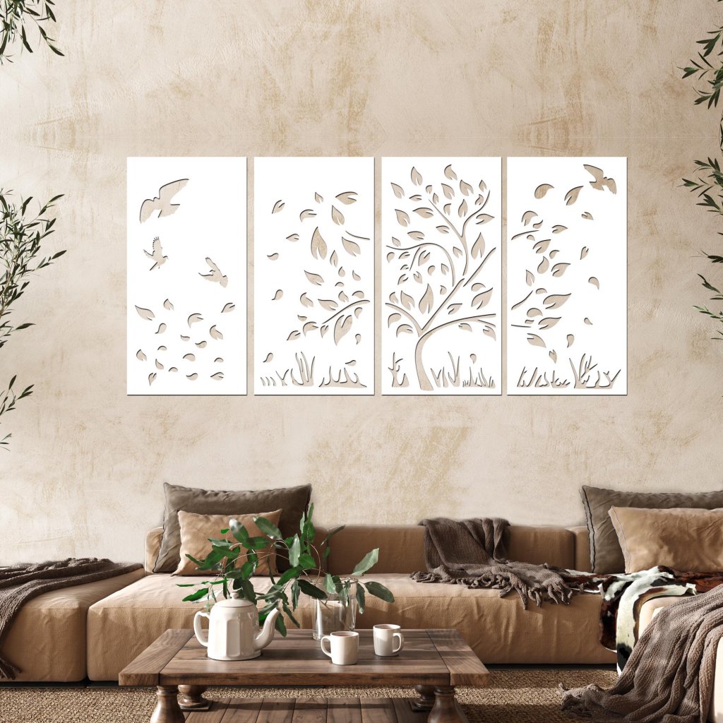 Rozdělení do čtyř částí dodává obrazu vzdušnost a možnost variabilního rozmístění na stěně. Vyřezávaný motiv působí plasticky a živě, ať už jej zavěsíte nad pohovku, postel nebo do vstupní haly.