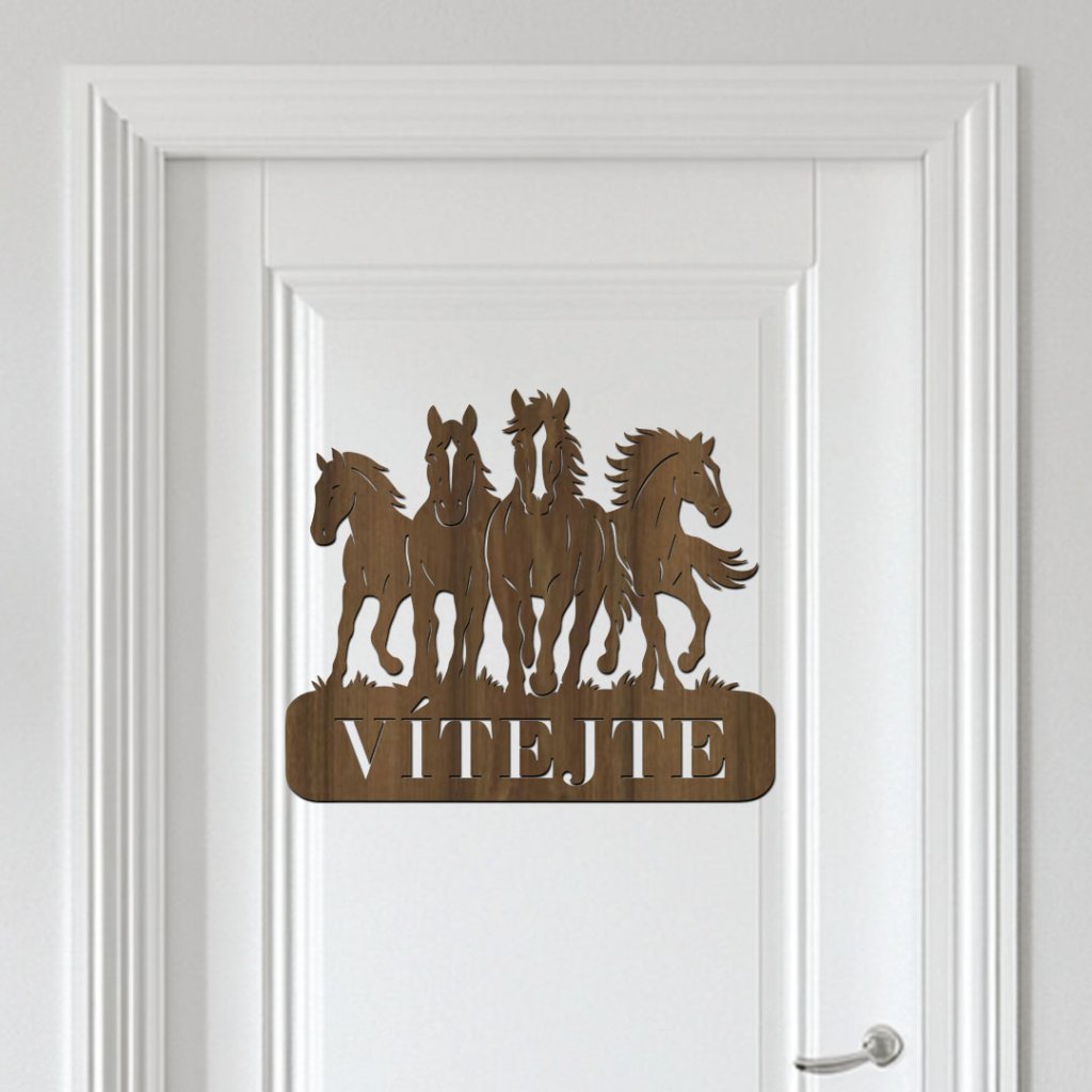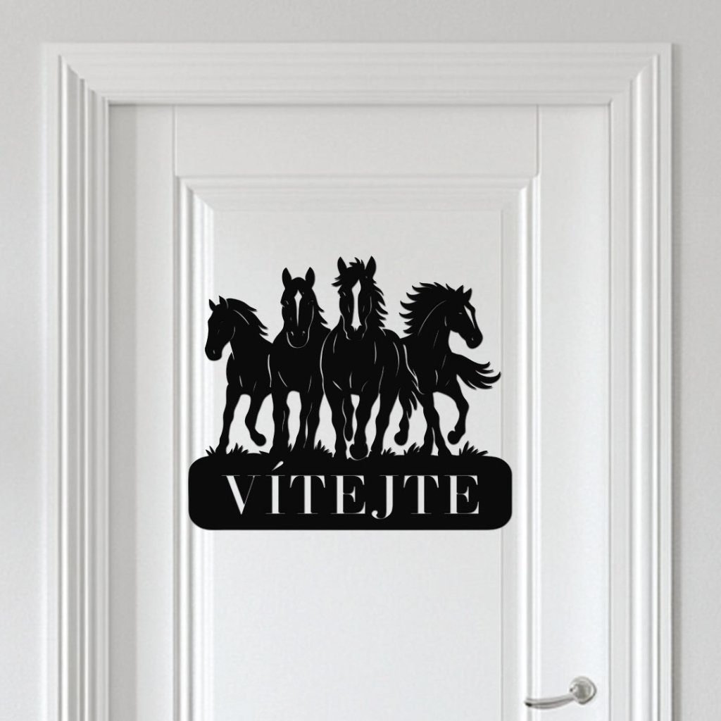 Cedulka Vítejte s motivem koní je srdečným pozváním hned u vstupu. Spojuje symboliku koně – svobody, síly a pohybu – s přátelským gestem, které dává každému příchozímu pocit, že je vítán. Ideální volba pro domy, statky, ranče, jezdecké areály i interiéry, kde mají koně své čestné místo.
