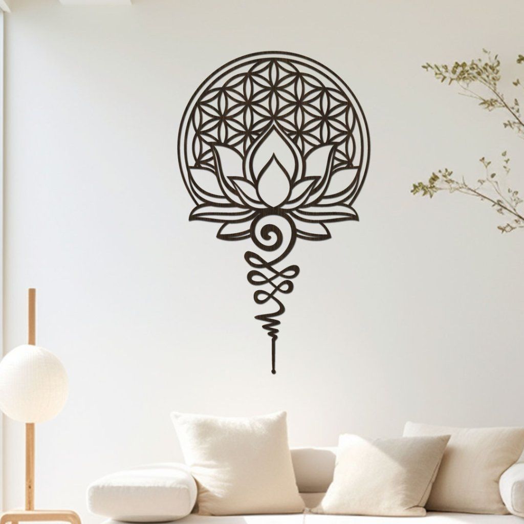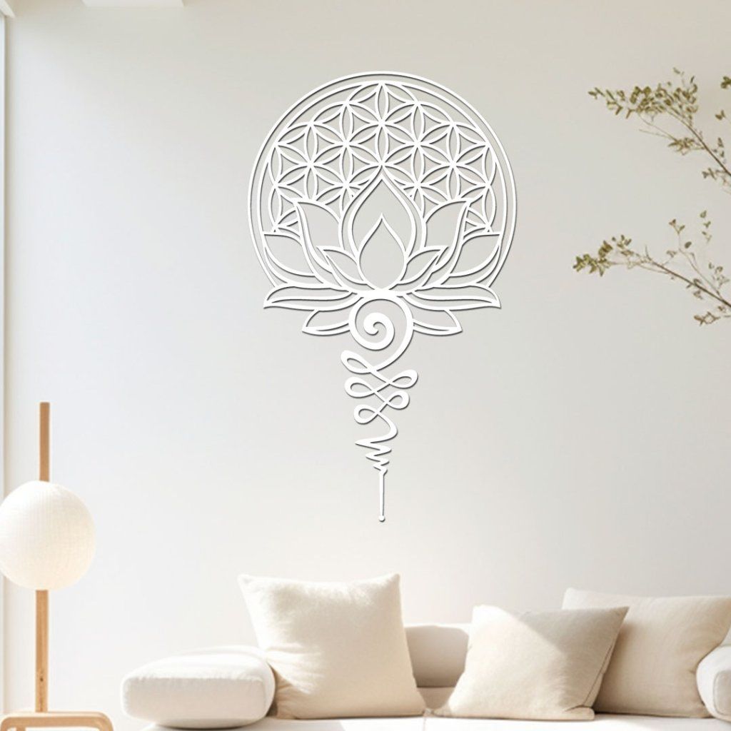 Motiv unalome vyjadřuje životní proces růstu a poznání. Spirála představuje začátky, chaos a hledání směru. Linie směřující vzhůru pak jasnost, pochopení a vnitřní klid. V kombinaci s květem života a lotosem vzniká silný symbol transformace, harmonie a probuzeného vědomí.